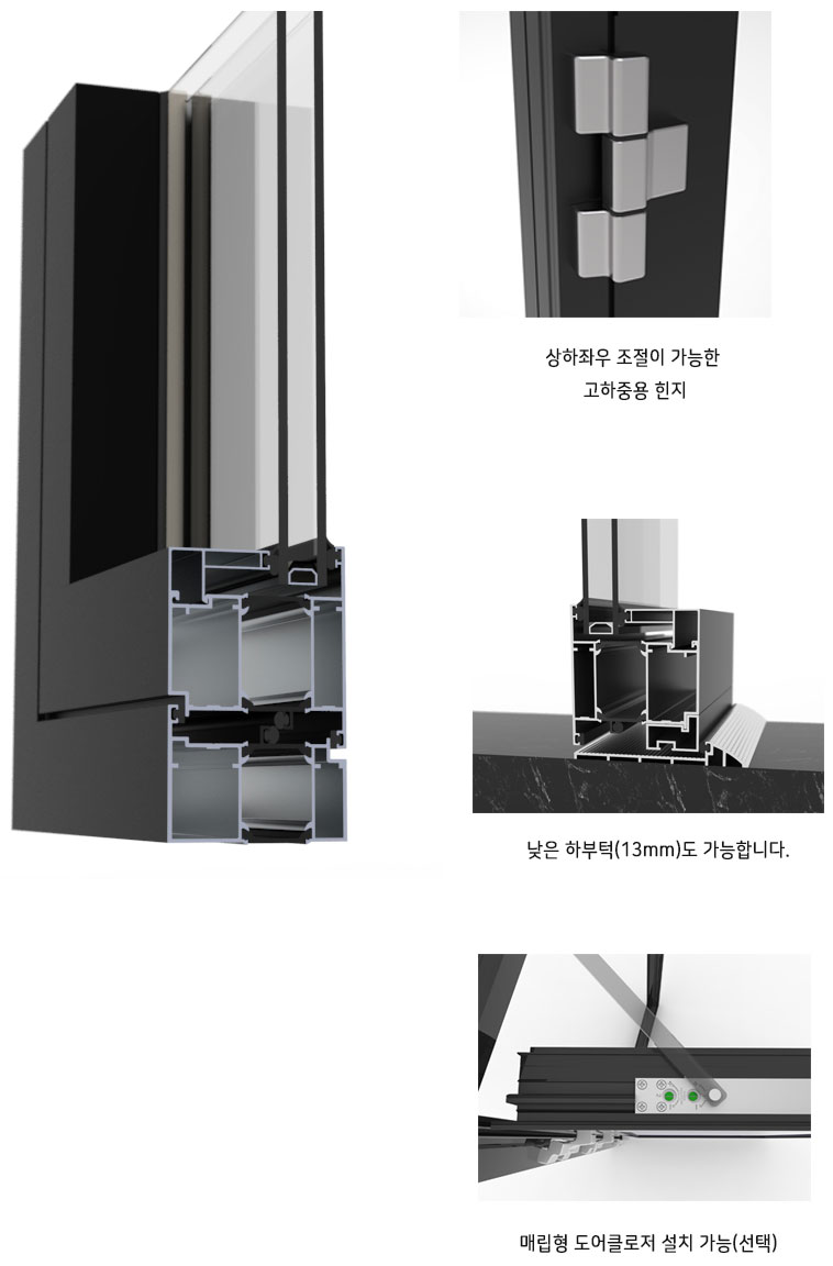 알루미늄 프로파일 중간에 열전도를 차단하는 Polyamide를 삽입한 도어로 열전도에 의한 에너지 손실 및 결로를 줄여줍니다.